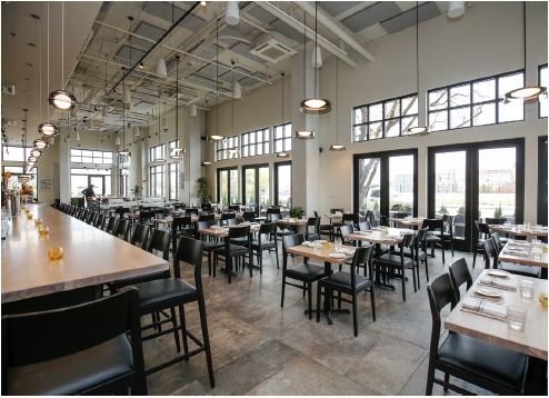 The exhibition kitchen, bar and separate bakery and market area run parallel to the dining room, which extends along most of the length of 4,000 square foot space. With seating for over 100, guests can choose from sitting at the bar, regular tables, highboys in the windows, or for the best seats in the house, the four-top chef’s table set amongst the cooks’ stations.